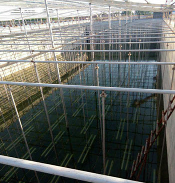 懸掛鏈式微孔橡膠膜管曝氣系統(tǒng)用于百樂卡工藝污水處理系統(tǒng)中。與其它曝氣技術(shù)的區(qū)別在于:布氣管道漂浮于水面,橡膠膜管曝氣單元通過懸掛軟管與漂浮布氣管相連,在曝氣過程中橡膠膜管曝氣單元在水下可自由擺動,具有低耗、