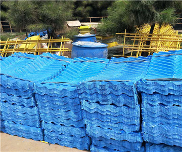 把在外場(chǎng)地粘貼好的單元冷卻塔填料運(yùn)到 冷卻塔內(nèi),安放成孔徑上下方向,然后有規(guī)則的緊密擺放到3-6層不等。