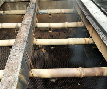 冷卻水在循環(huán)過(guò)程中,不可避免的產(chǎn)生泥灰、脫落銹渣、微生物體等雜物,也會(huì)堆積堵塞填料間歇,冷卻塔的冷卻效果也會(huì)明顯下降,因此更換填料也是清堵的過(guò)程,要及時(shí)運(yùn)出水堿垃圾, 清理頂部布水槽。