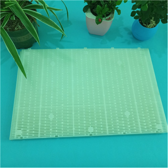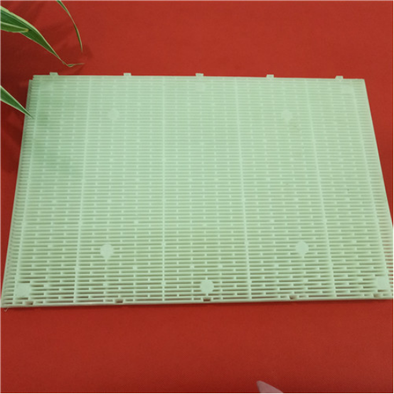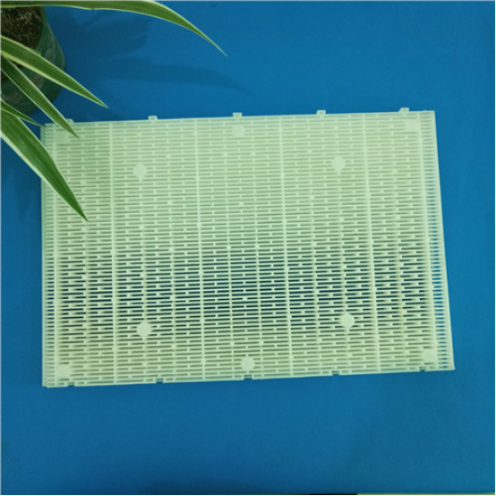 D型濾池過濾板是一種D型濾池里和彗星濾料配合使用的一種過濾裝置,用于固液分離,為了防止濾料再反沖洗過程中流失。并且可以阻止二沉池浮渣對濾料的影響,提高了濾池的產(chǎn)水能力。其間隙為1.5~1.8mm,可以阻止陽光的直射,減緩濾料中藻類的生長。但上部蓋板表面藻類生長還是比較明顯,因此對于污水廠二級生化處理出水需要增加過濾單元時,建議增加頂蓋遮陽和設置殺藻、殺生物膜藥劑,如:次氯酸鈉、二氧化氯等。