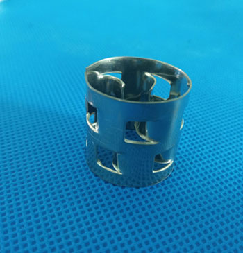 鮑爾環(huán)填料是一種新型填料,是針對拉西環(huán)的一些主要缺點加以改進(jìn)而出現(xiàn)的,雖然環(huán)外徑也是等于高度,但環(huán)壁上開出兩排帶有內(nèi)伸舌片的窗,每層窗孔有5個舌片。這種結(jié)構(gòu)改善了氣液分布,并且讓環(huán)的內(nèi)表面得到了充分利用。與拉西環(huán)相比,處理量可大50%以上,而壓降低一半。